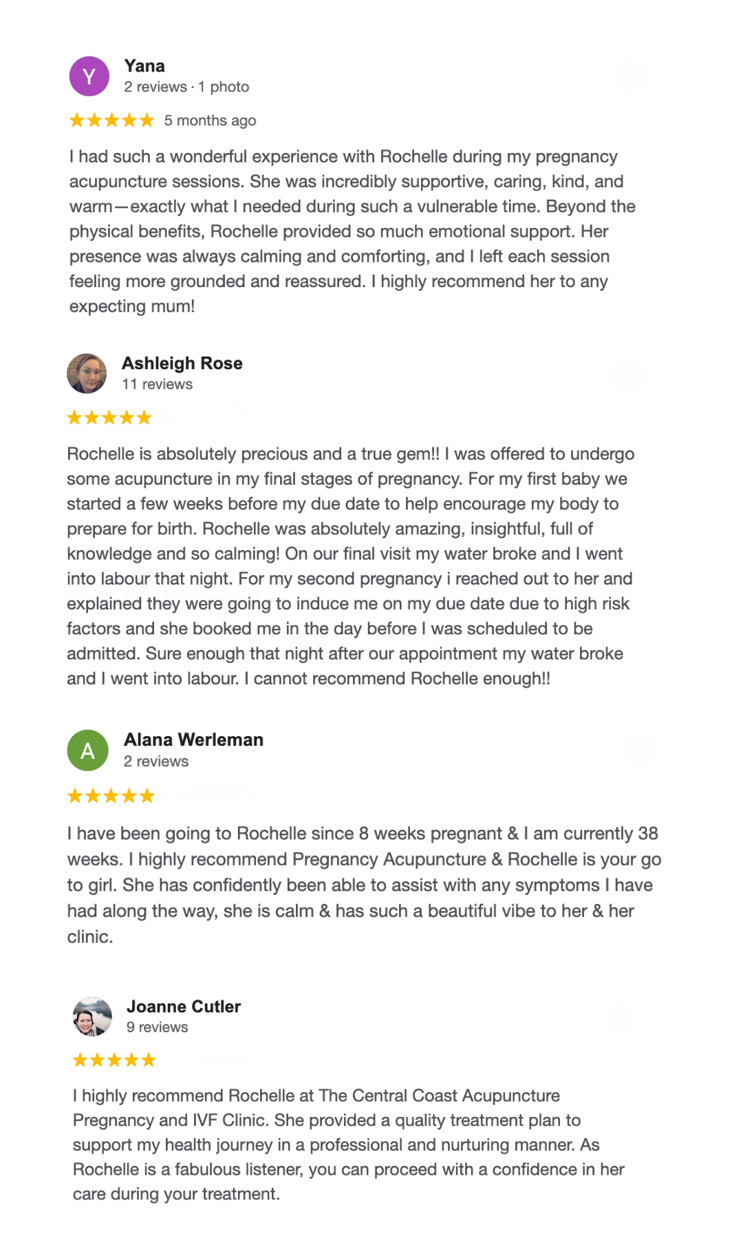 I had such a wonderful experience with Rochelle during my pregnancy acupuncture sessions. She was incredibly supportive, caring, kind, and warm—exactly what I needed during such a vulnerable time. Beyond the physical benefits, Rochelle provided so much emotional support. Her presence was always calming and comforting, and I left each session feeling more grounded and reassured. I highly recommend her to any expecting mum!