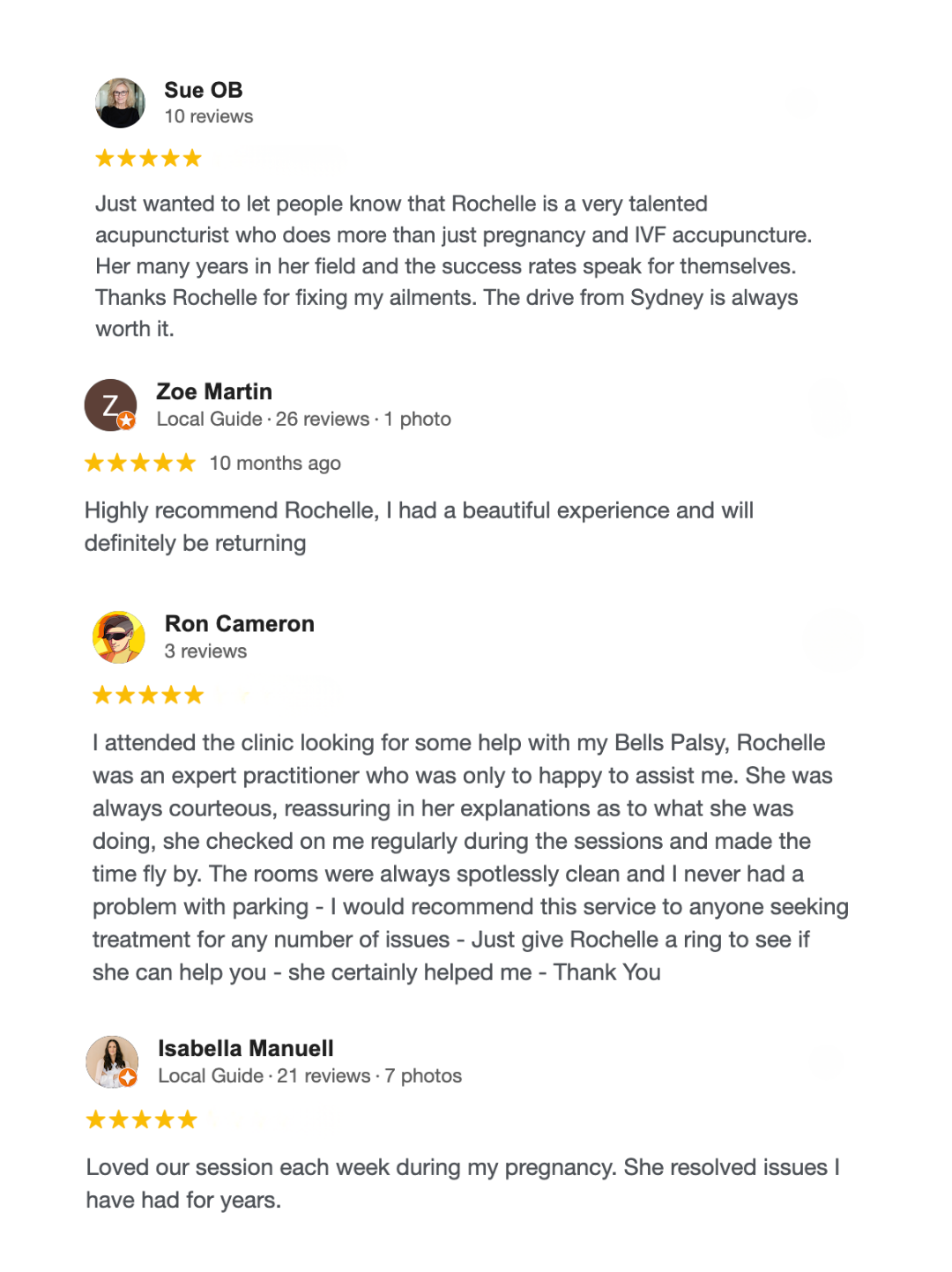 Just wanted to let people know that Rochelle is a very talented acupuncturist who does more than just pregnancy and IVF accupuncture. Her many years in her field and the success rates speak for themselves. Thanks Rochelle for fixing my ailments. The drive from Sydney is always worth it.